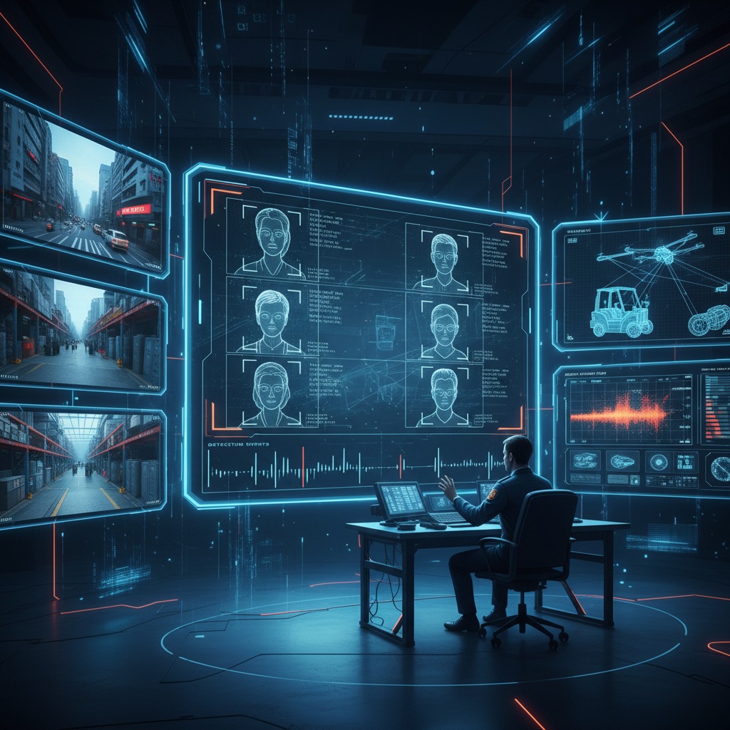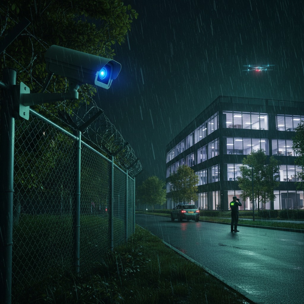 Indústria protegida com CCTV robusto, perímetros controlados e automatização segura.