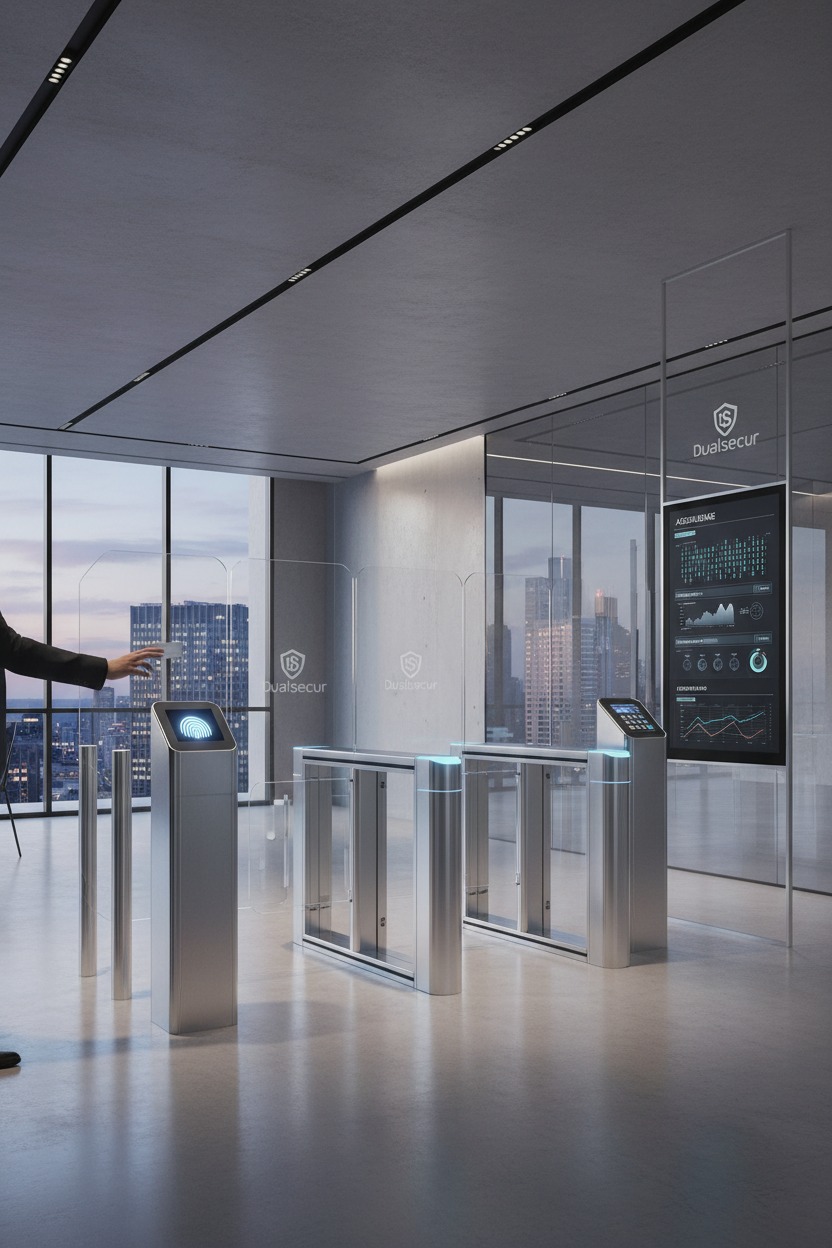Os sistemas de Controlo de ponto e de acessos da Dualsecur integram as tecnologias mais recentes, incluindo soluções biométricas, RFID e códigos binários para diferentes níveis de segurança. Disponibilizamos ainda hardware e software completos para gestão de assiduidade e controlo de ponto. Adaptamos cada projeto à realidade do cliente, garantindo uma resposta técnica adequada para qualquer tipo de edifício ou cenário operacional.